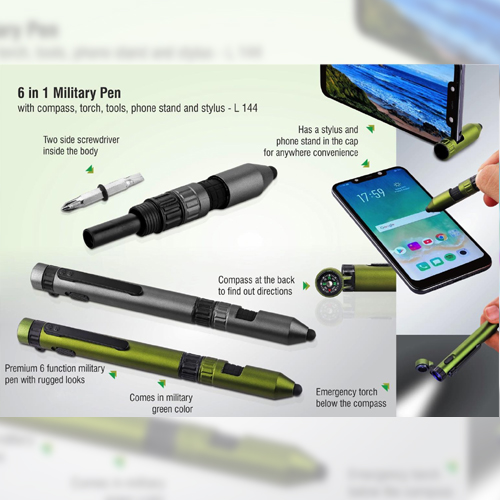 The 6 in 1 Military Plastic Pen with compass, torch, tools, phone stand and stylus also stands out for its versatility across various industries, including IT companies, adventure brands, logistics firms, defense-themed events, automobile companies, and travel-related giveaways. Its rugged appearance enhances its appeal, making it a great choice for premium branding and thoughtful business gifting.