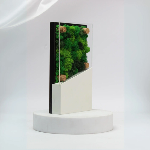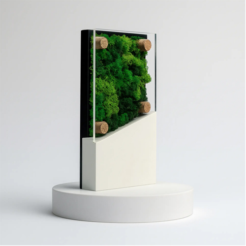 This award stands out because it integrates natural preserved moss and organic elements without requiring maintenance. The preserved greenery adds a calming, biophilic touch that enhances interiors and makes the award truly memorable. Whether used as a corporate gift, milestone recognition, or eco-themed accolade, it communicates a strong message of sustainability and appreciation.