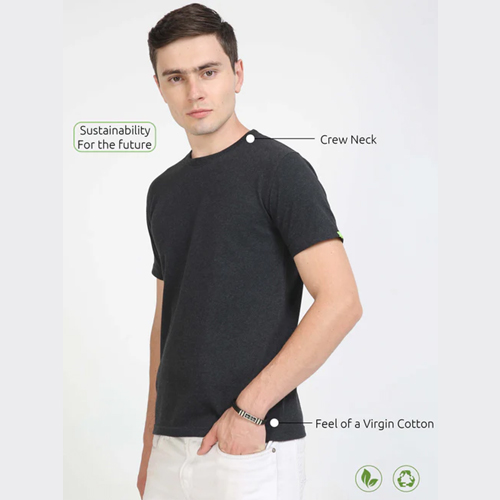 Elevate your eco-conscious fashion with our crew neck charcoal eco friendly t shirts. Made from organic materials and ethically produced, it’s a wardrobe essential that combines style with sustainability, ensuring you look good and feel good. Our fabric comprises 60% pre-consumed cotton waste and 40% recycled PET bottle scrap, a testament to our commitment to environmental responsibility and contemporary style.