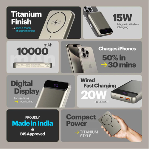 The Click 10000mAh MagSafe Power Bank With Wireless Charger is not just about performance—it’s also about trust and quality. Proudly made in India, it reflects high manufacturing standards, durable materials, and reliable battery safety features. Advanced protection safeguards against overcharging, overheating, and short circuits, ensuring safe usage for your valuable devices.