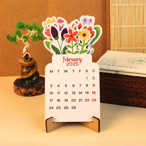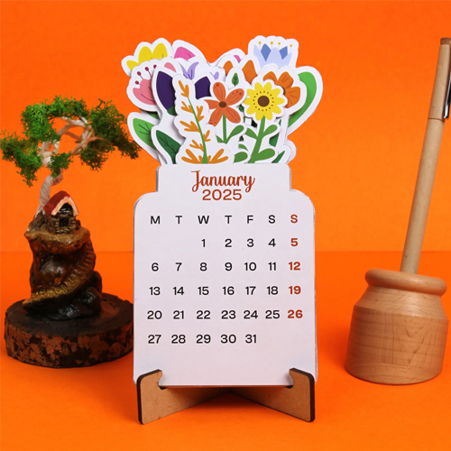 The Floral Bouquet Calendar (MDF) Eco-Friendly is a beautifully crafted table accessory designed for homes, offices, workstations, and corporate desks. This premium MDF desk calendar features 12 monthly cards cut in a unique flower bunch shape (3.5″×7″), making it both functional and visually appealing. The thoughtfully integrated pen/pencil slot adds practicality and ensures your stationery stays organized. Each unit also includes a DIY MDF stand that you can assemble easily, making it an exciting element for customers who appreciate eco-friendly, reusable desk accessories.