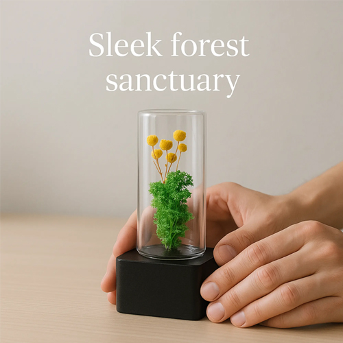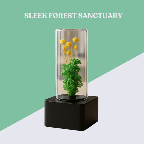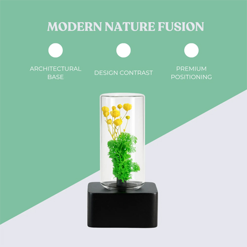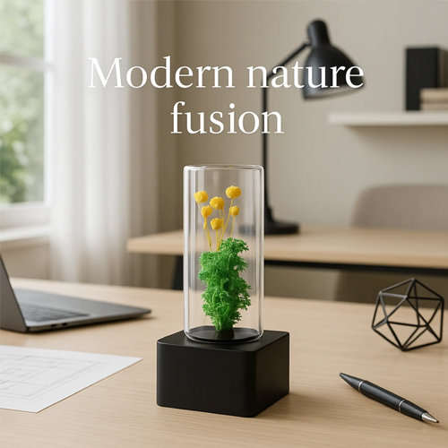 Crafted with a high-quality glass cylinder placed firmly on a durable black MDF base, this Forest Cube showcases beautifully preserved moss and natural flowers that require no watering, sunlight, or maintenance. The compact dimensions of 90mm height and a 50mm × 50mm base make it ideal for desks, display shelves, reception counters, meeting rooms, and employee welcome kits.