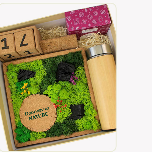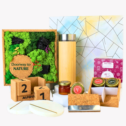 This eco-friendly gift set includes a stunning Forest Painting (9″x10″), a durable Bamboo Bottle 450ml, elegant Marble-Brass Coasters, a reusable Cork Calendar, a rich Honey Pack in four natural flavours, a premium Cork Card Holder, and a sleek Premium Gift Box (12″x10″x4″). Each element is selected to promote sustainability while offering high-end utility, making this set a perfect choice for brands looking to embrace environment-friendly gifting solutions.
