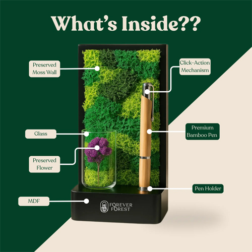 Whether you’re curating a thoughtful corporate hamper or upgrading your personal work desk, this pen stand adds instant charm and professionalism. It remains visually appealing across seasons, making it suitable for long-term interior décor. The premium bamboo pen included further enhances your writing experience with smooth performance and eco-friendly construction. With sustainability becoming a major global priority, gifting an item that features a 3+ year lifespan and natural preserved greenery sends a powerful message of care, responsibility, and refinement.