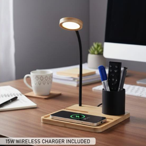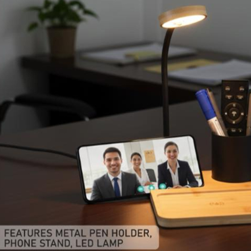 The combines advanced functionality with natural design. Whether used as a personal desk accessory or as a branded promotional gift, this product offers unmatched utility. Its wireless charging pad ensures clutter-free charging, while the LED lamp elevates workspace comfort. The metal pen holder and phone stand provide essential desk organization, making it ideal for professionals in corporate environments, home offices, cowering spaces, and educational setups.