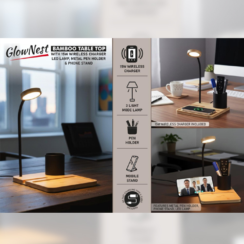 GlowNest: Bamboo Table Top with 15W Wireless Charger, LED Lamp & Pen Holder