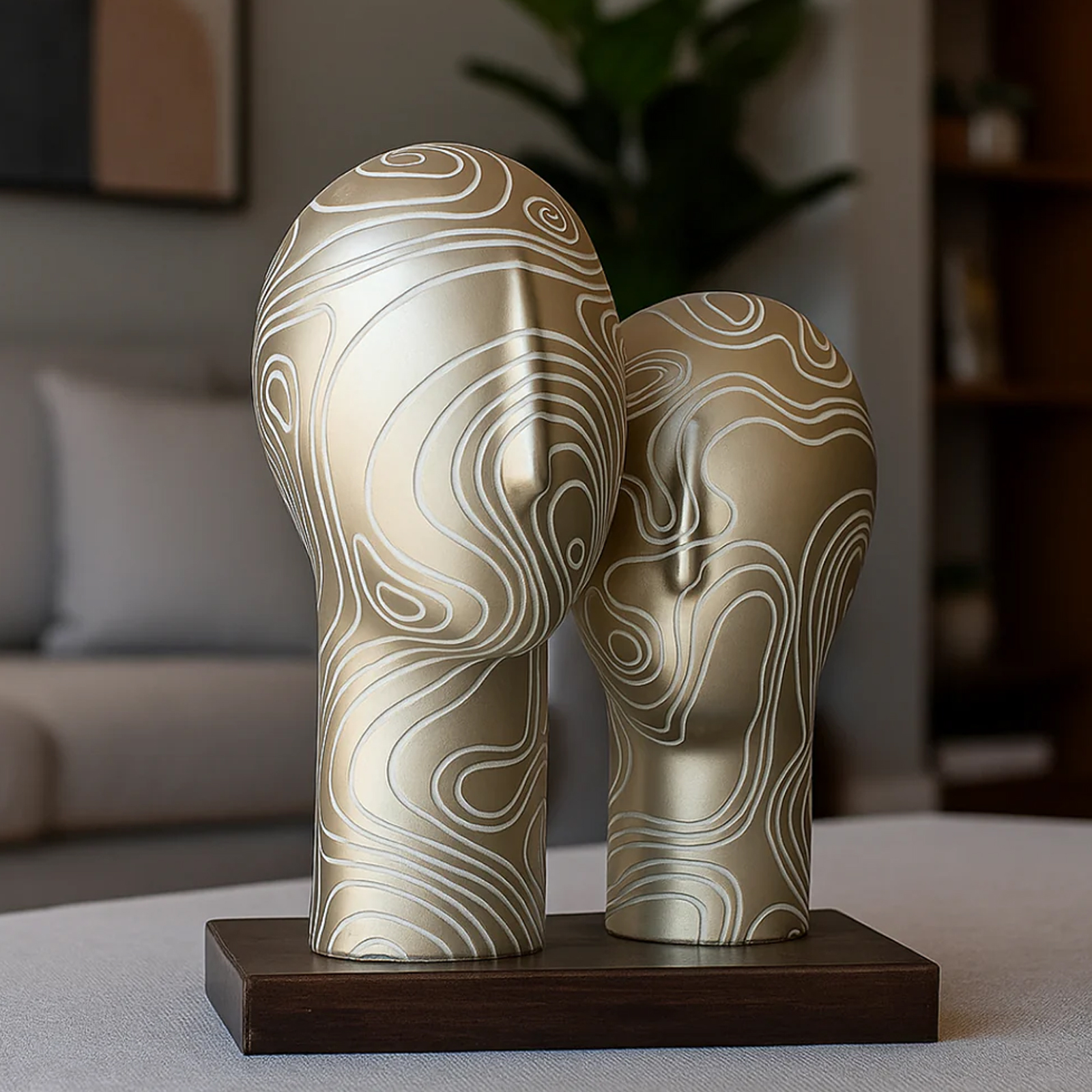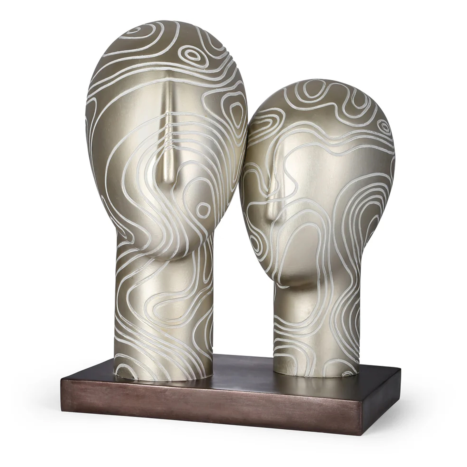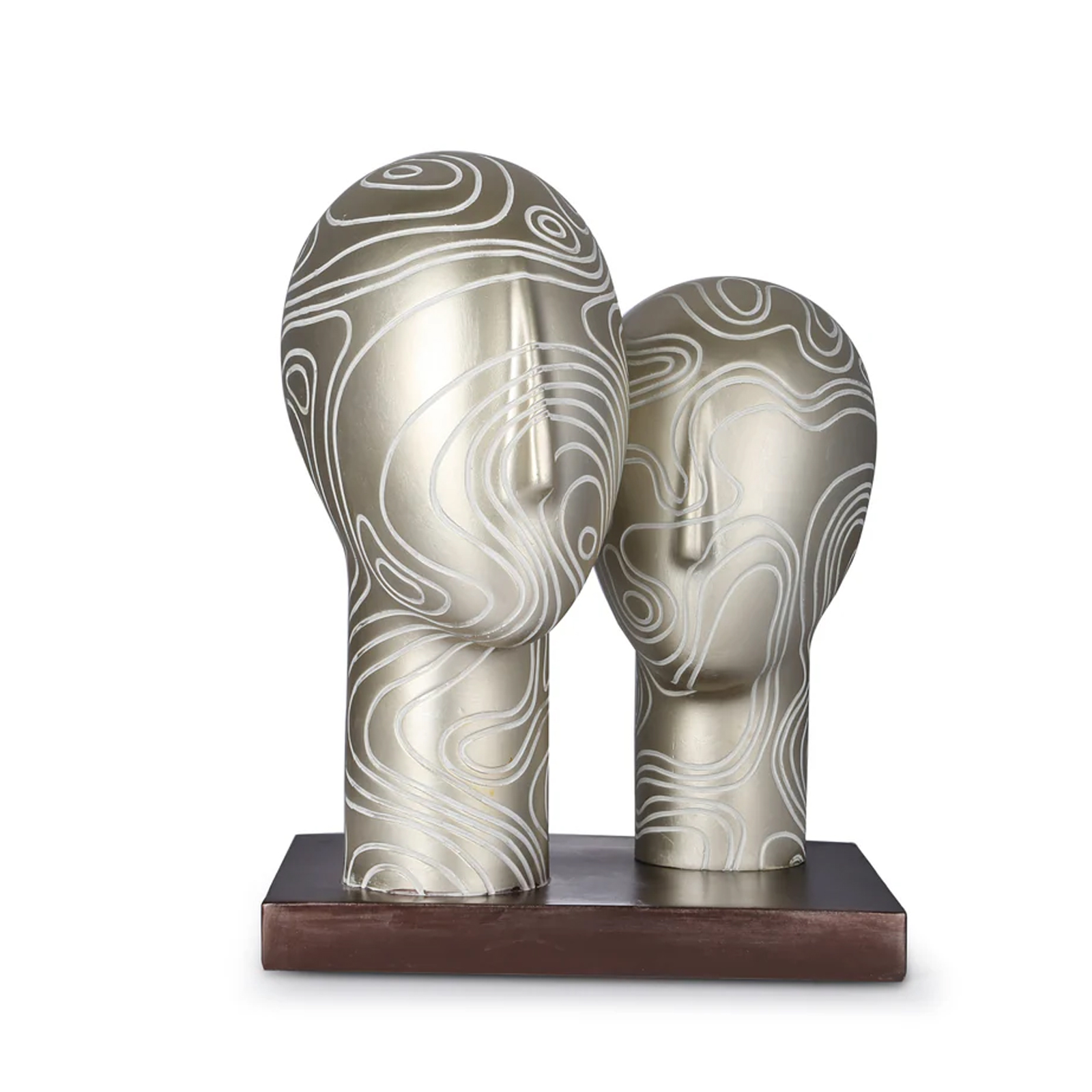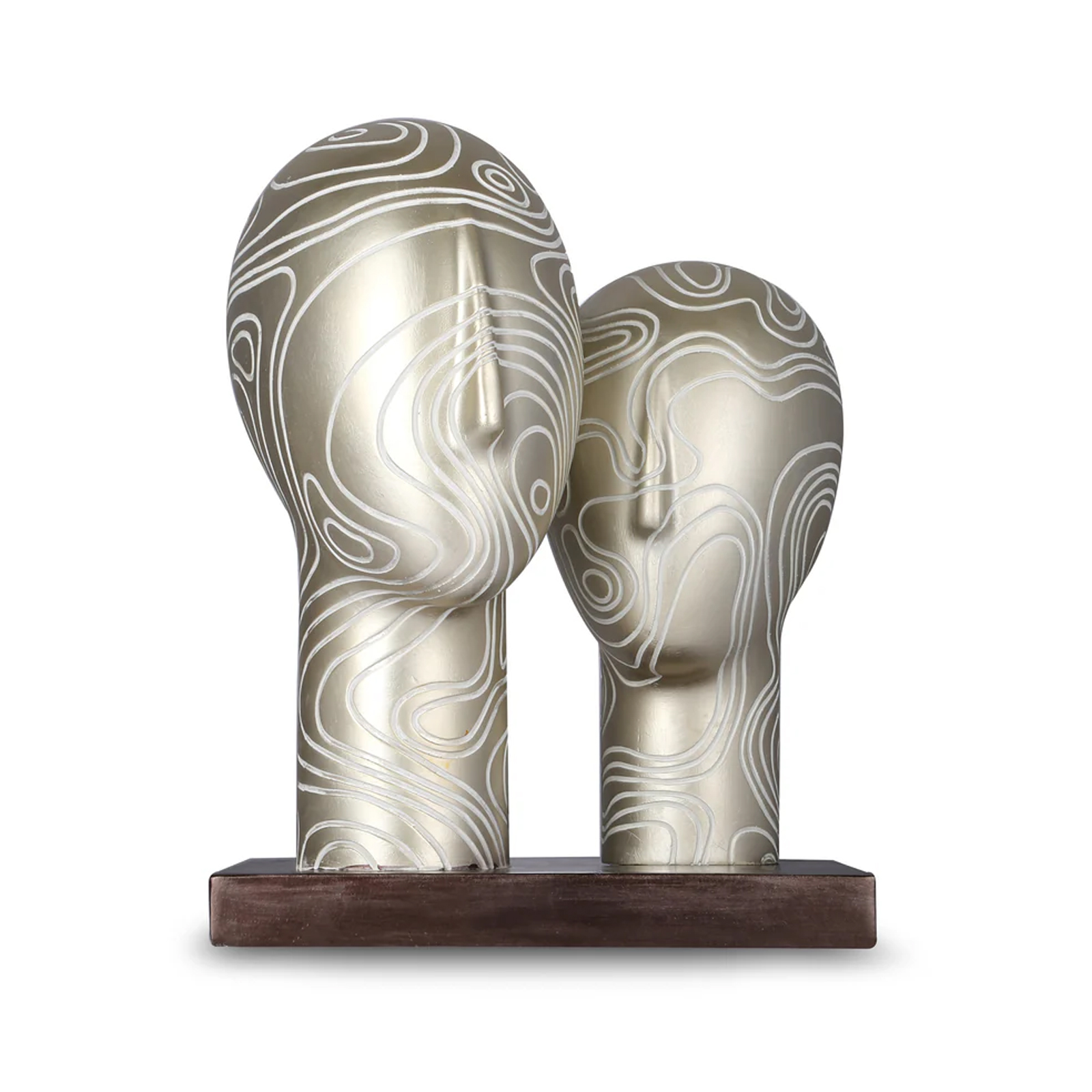 Make a bold statement in your living space with the Double Bust Sculpture. Standing at an impressive 36 cm, this contemporary art piece features two minimalist busts joined together on a sleek rectangular base. Each head is sculpted with clean, modern lines and adorned with flowing contour patterns reminiscent of topographical maps, creating a captivating interplay of movement and form. Crafted in a refined metallic finish, the sculpture strikes a balance between avant-garde style and understated elegance. Whether placed on a console, coffee table, bookshelf, or office desk, it commands attention as a conversation starter while blending seamlessly with modern, industrial, or eclectic interiors. This Double Bust is more than just décor; it is an artistic representation of connection, duality, and unity, making it ideal for design enthusiasts and art lovers alike.