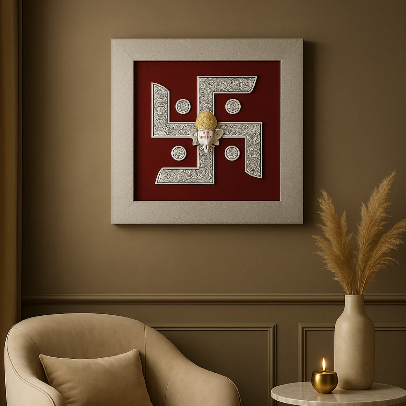 Standing at 55 cm in height, this frame makes an impressive focal point on walls, console tables, or pooja rooms. Its artistic craftsmanship enhances the beauty of the Swastik motif, while the elegant finish complements a wide variety of décor styles, from modern and minimalist to classic and traditional. Whether you use it as a decorative wall hanging, a framed centerpiece for your entryway, or as part of your temple décor, it creates an inviting and serene ambience.