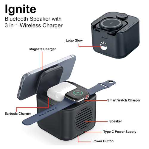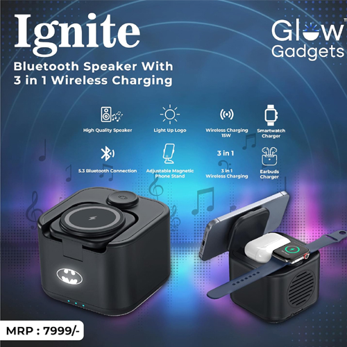 The Glow Gadgets Ignite 3 in 1 Wireless Charger & Bluetooth Speaker is a premium all-in-one smart accessory designed for modern workspaces, homes, and gifting needs. Combining multi-device wireless charging with a high-quality Bluetooth speaker, this innovative gadget delivers convenience, performance, and style in one compact unit. Engineered with Qi-enabled technology, it supports seamless charging for smartphones, earphones, and smartwatches while enhancing your desk aesthetics with a light-up logo and durable finish.