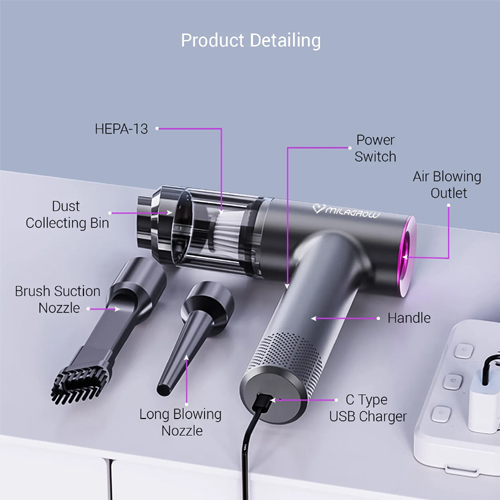 The Milagrow Duster Lux  Vacuum Cleaner Is A Compact & Premium Portable Vacuum With Mammoth 14000 Pa Suction And A 6000 MAh Battery. Its Vibrant & Luxurious Design Is Complemented By A HEPA-13 Filter For Effective Dust And Allergen Removal. It Comes With Four Versatile Accessories Making It Perfect For Cleaning Tricky And Hard To Reach Car, Home, Kitchen And Office Spaces.