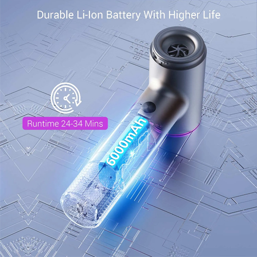 2. Battery Power- With A 6000 MAh Li-Ion Battery Delivering 24-34 Minutes Runtime, It Allows For Uninterrupted Cleaning Sessions