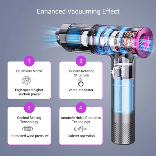 6. Powerful Suction & Quiet Operation – The Brushless Motor Delivers An Impressive 14000 Pa Suction Power From Compact Vacuum. Thanks To Its Efficient Design, This Cordless Handheld Vacuum Produces Just 40 DB Noise, Preventing Disturbances To Your Family And Pets.