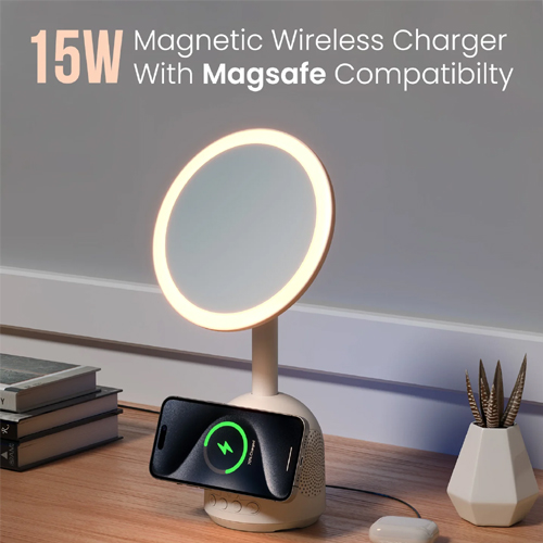 The Portronics Movo II Wireless Charger With Makeup Mirror | Bluetooth Speaker is a perfect blend of technology, convenience, and elegance. Designed for modern lifestyles, this multifunctional device combines a fast, premium and illuminated into one sleek unit.