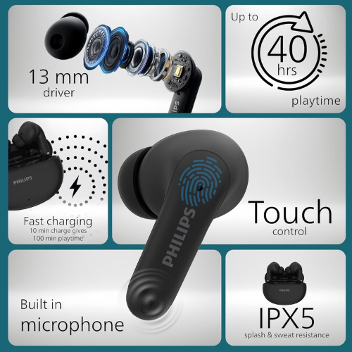 Philips TAT1269 Bluetooth Truly Wireless in Ear Earbuds with mic, 13mm Drivers, Bluetooth 5.4, 40H Playtime, IPX5, Fast Charging, Touch Controls, Voice Assistant
