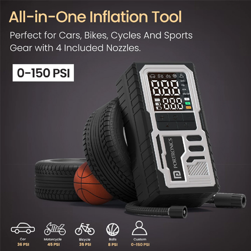 The Portronics Vayu 10 Tyre Inflator is a compact, powerful, and reliable solution designed to keep your tyres perfectly inflated anytime, anywhere. Built for convenience and performance, this portable & rechargeable tyre inflator is ideal for cars, bikes, scooters, bicycles, and even sports balls. With its intelligent features like Type-C fast charging, LED digital display, and auto shut-off technology, Vayu 10 ensures safe, precise, and effortless inflation.