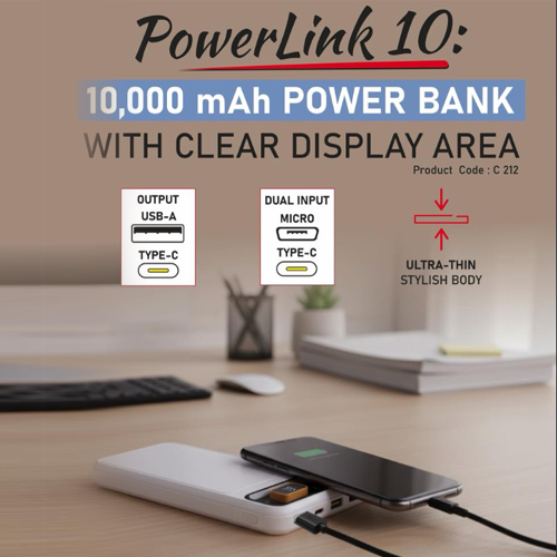 With a compact and modern design, PowerLink 10 delivers unmatched performance. The dual USB-A and Type-C ports allow you to charge multiple devices simultaneously, ensuring maximum efficiency. Whether you’re commuting, traveling, or working outdoors, this 22.5W fast charging power bank ensures your devices stay powered all day long.