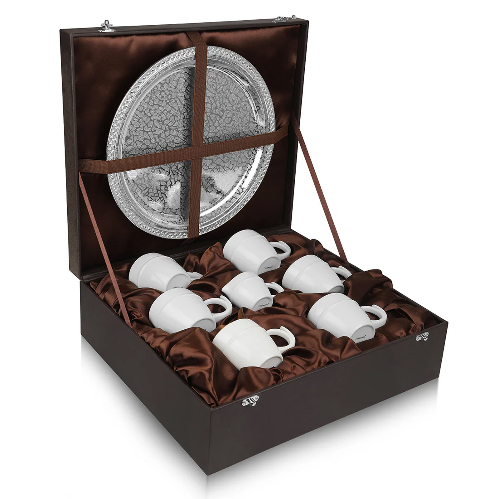 There’s a bit of a mix-up here since the image doesn’t show a milk pot. What it does show is a beautifully presented round silver decorative plate (or thal) secured in a dark brown box lined with brown satin. The plate has a crackle pattern design with a decorative border around its edge. In the same box, but in a separate compartment below the plate, there are six elegant white tea cups. These cups have handles and are carefully nestled in brown satin fabric for protection and a touch of luxury. The box itself is dark brown with silver clasps on the front and is presented against a clean, plain white background, highlighting the items inside. Bring a touch of elegance and sophistication to your tea-time rituals with this beautifully designed Round Silver Thal Tea Set. Thoughtfully crafted to impress your guests, this set comes with six classic tea cups and a stylish milk pot, all placed on a graceful round silver thal (tray). The silver-finished tray features a stunning embossed border pattern, adding a regal charm to your serving experience. It’s not just functional but also a piece of art that elevates the look of your dining or living space. Each cup is made from high-quality material in a sleek white finish with delicate silver lining, blending modern simplicity with timeless elegance. Perfect for family gatherings, high-tea sessions, festivals, and special occasions, this set will instantly make your presentation more appealing. Its sturdy build ensures it can handle regular use, while the smooth finish makes it easy to clean and maintain. Whether you’re entertaining guests, enjoying a quiet evening tea, or looking for a premium gift for loved ones, this tea set is a complete solution.