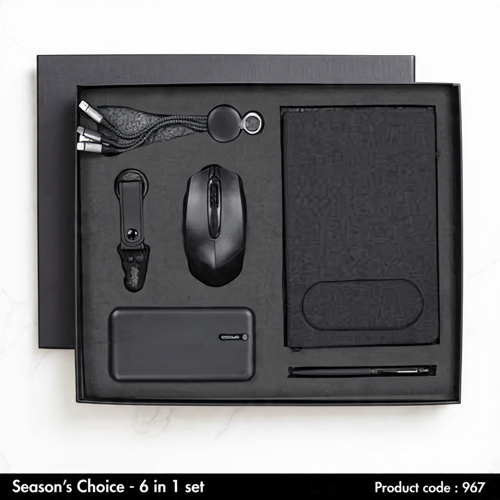 The Season’s Choice – 6 in 1 Gift set is a thoughtfully curated premium corporate gift designed to combine style, utility, and sophistication. This all-in-one executive gift hamper includes a Diary, Pen, Mouse, Charging Cable, Power Bank, Keychain, and Gift Box, making it a perfect choice for businesses looking for high-quality corporate gifting solutions.