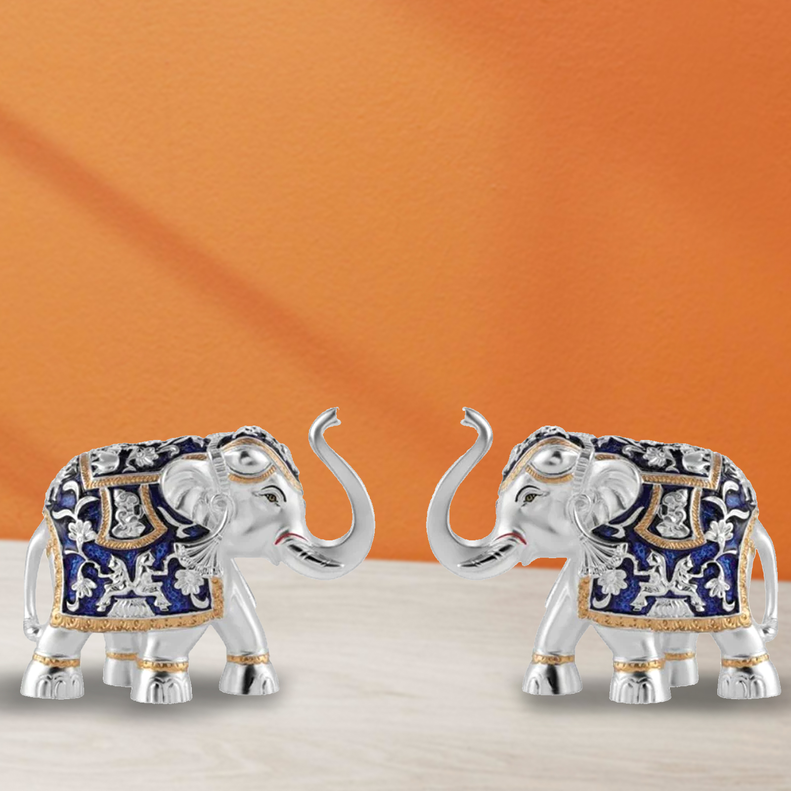 Bring home timeless elegance with this Set of 2 Silver Blue Meena Elephants (Medium – 9.5 cm) – a stunning representation of artistry and tradition. Crafted with precision, these elephants feature a brilliant silver finish adorned with royal blue meenakari detailing that highlights their intricate patterns and majestic posture.