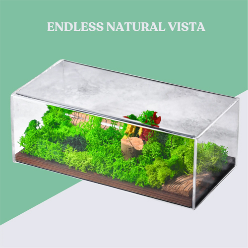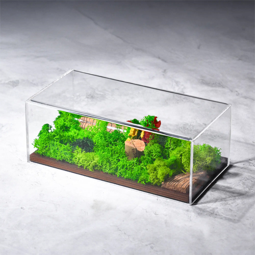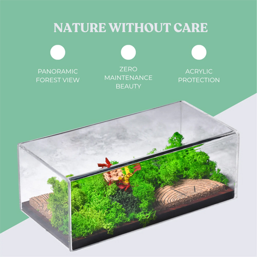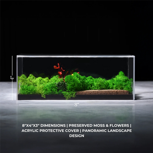 The acrylic protective cover shields the preserved moss and flowers from dust, moisture changes, and accidental damage, ensuring that your terrarium stays vibrant and fresh for years. This cover also enhances clarity, making the forest scene easy to view from all angles. Its wide vista design gives you a miniature landscape that displays depth, tranquility, and artistic charm—perfect for enhancing any modern or rustic aesthetic.