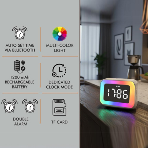 Whether you’re upgrading your workspace, adding a modern touch to your bedside table, or searching for a gift-worthy Bluetooth speaker, is the perfect choice. Its multifunctional design combines an elegant digital clock display, immersive audio experience, and decorative LED RGB lights – all in one compact device.