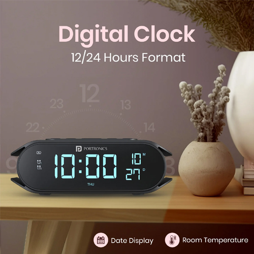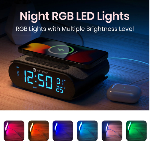 The Portronics VoltClock Wireless Charger, Dual Alarm Clock, Temperature Display, Date Display, Night RGB LED Light, Color : Black, Product Type : Wireless Charger 15W