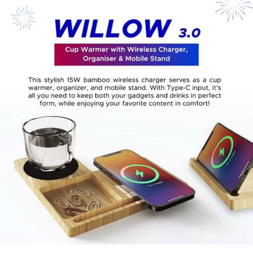 Upgrade your daily desk experience with the Willow 3.0 15W Wireless Charger With Cup warmer & Phone Stand, a premium multifunctional accessory designed for modern professionals, home offices, and corporate gifting. Built to combine convenience, efficiency, and style, this innovative desk companion delivers fast 15W wireless charging, a built-in cup warmer, and an integrated phone stand & organizer in one compact unit.