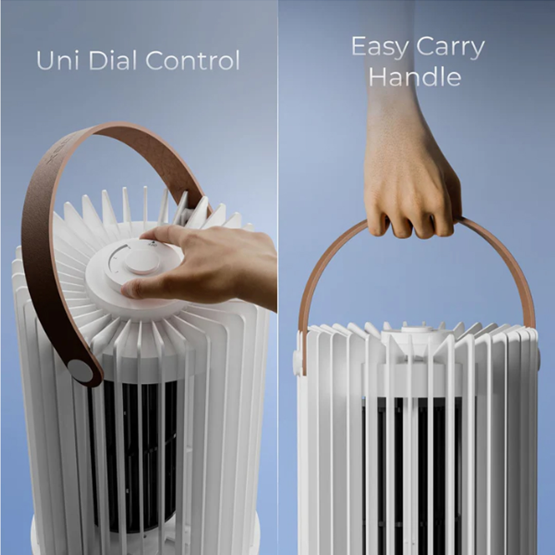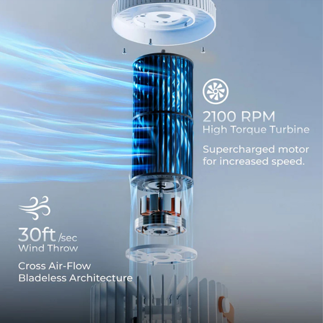 Future Fan PRO , a next-generation bladeless tower fan  engineered for superior airflow and wider coverage . Powered by a high-torque 2300 RPM motor , it delivers an ultra-fast wind throw  with a seamless 100° oscillation , ensuring uniform cooling across the room. Its Cross Air-Flow Bladeless Architecture  accelerates airflow, while the 3-speed settings  allow personalized cooling—from a gentle breeze to high-speed ventilation. Designed for modern homes and workspaces , its sleek, vertical build  blends into any interior, while the uni-dial control  provides effortless operation.