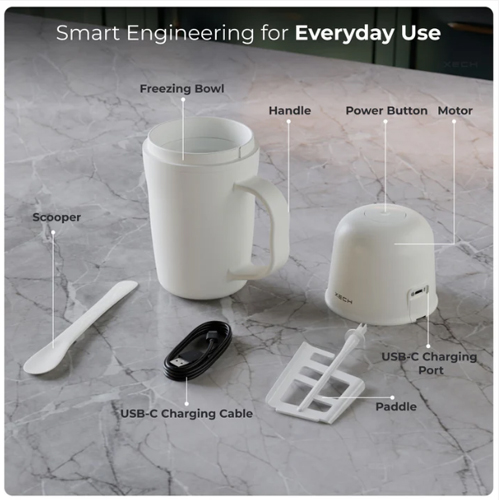 Upgrade your dessert routine with a machine that is fast, compact, and easy to operate. With dependable freezing performance, user-friendly controls, and USB-C power, this home Xech ice cream maker turns your kitchen into a mini dessert studio. Prepare, churn, scoop, and smile—repeat whenever you like.