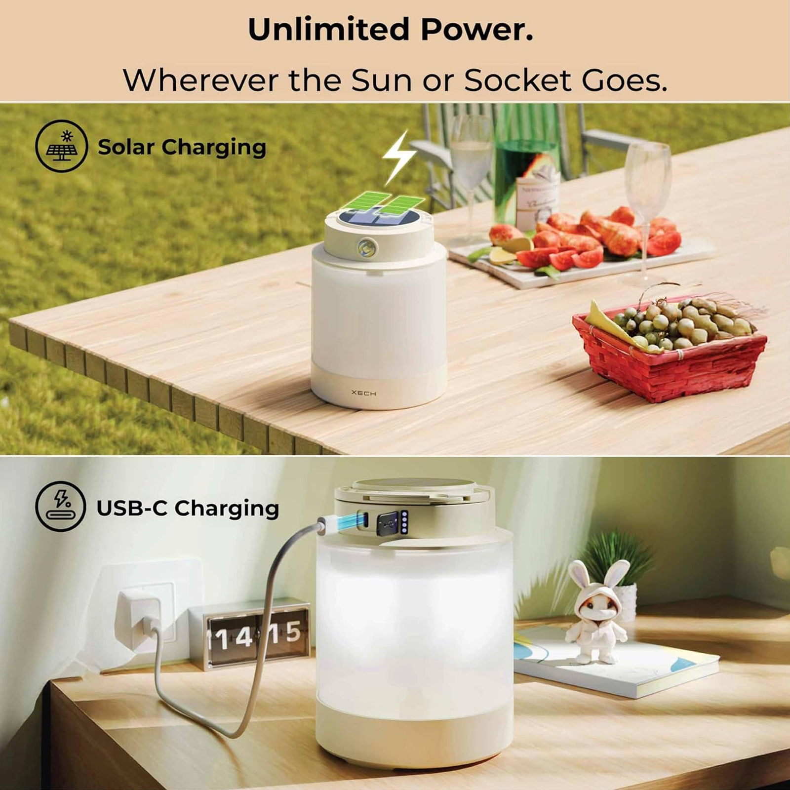 - Dual-charging: Solar + USB