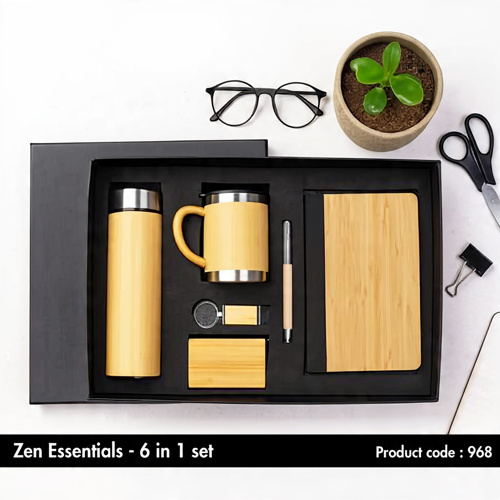 If you are searching for a premium that combines practicality with sustainability, the Zen Essentials – 6 in 1 Gift Set Eco-Friendly is the ideal choice. Designed for daily use at office or home, this corporate gift hamper helps businesses leave a lasting impression on clients, employees, and partners.